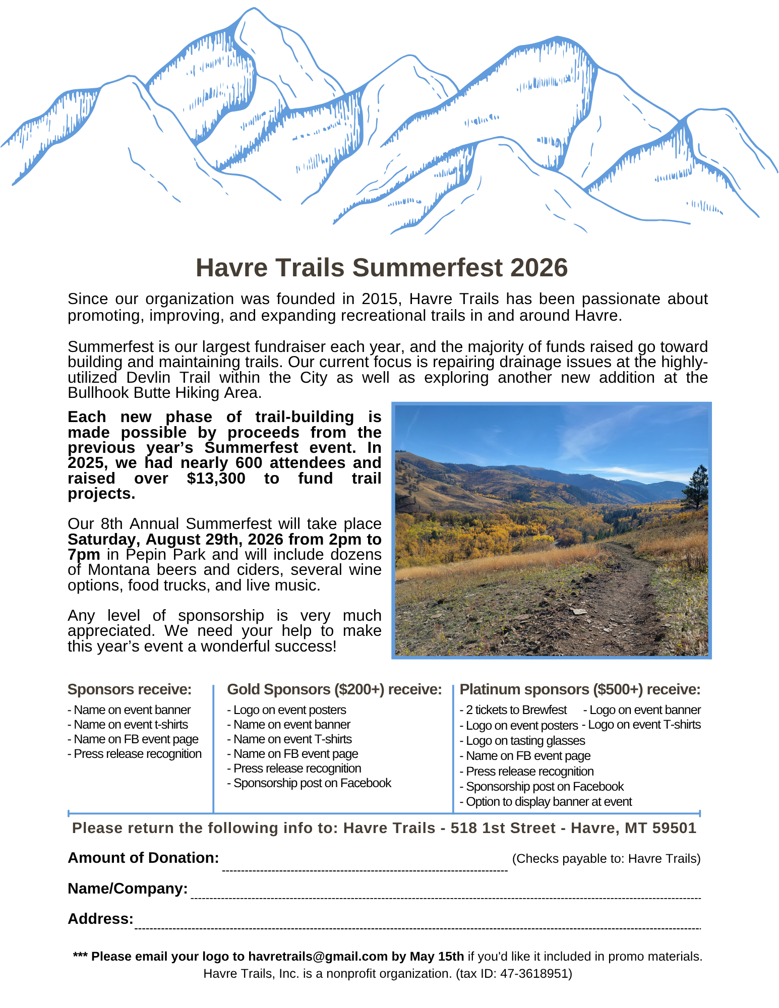 Each year, Havre Trails hosts its annual Summerfest (formerly Brewfest) in Havre’s beautiful Pepin Park. This is our biggest fundraiser event of the year that allows us to continue building and maintaining trails in the area. Whether drinking or not, this event provides an array of brews, wines, seltzers, food trucks, live music, auction items, and plenty more. Join us this year on Saturday, August 23rd, for a great time! Additional details: